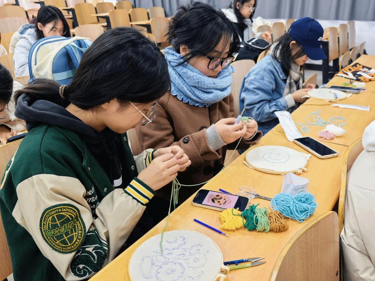 活动伊始,同学们满怀着期待与好奇,在简要的教学指导后,大家纷纷拿起独特的戳针和五彩的毛线,在绣布上开始了自己的创作,每个人都沉浸在专注而愉悦的氛围里。伴随着戳针轻快的“嗒嗒”声,同学们将天马行空的想象力和细腻的心思,一针一线地“戳”进画布。简单的线条逐渐变得丰满,单调的色块开始焕发生机,一个个充满个性的图案在指尖下慢慢绽放。