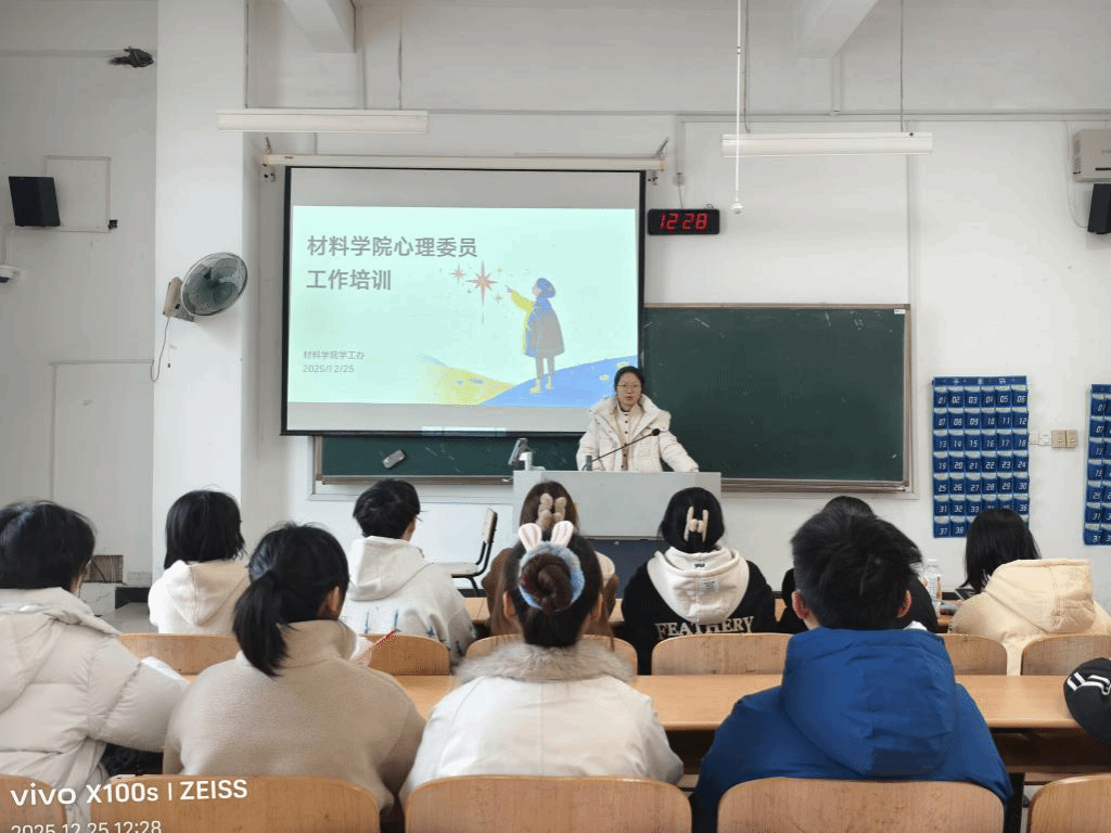 为强化心理委员队伍建设,提升其业务能力,材料工程学院于12月25日开展心理委员工作培训。25级新生心理委员及方舟心理社成员参与,学院心理健康工作站专员王敏老师主讲。