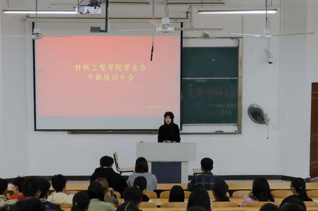 2019年10月16日12:30,材料工程学院学生会干事培训大会在6300召开。本次活动由组织部干事郭洪江主持,学生会副主席赵明珠(主持工作),学生会副主席金荣泰、施玲艳、王览月,各部部长和副部长,各部门新进干事参加本次活动。