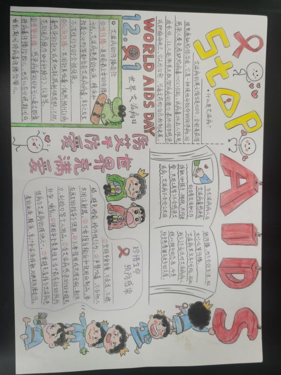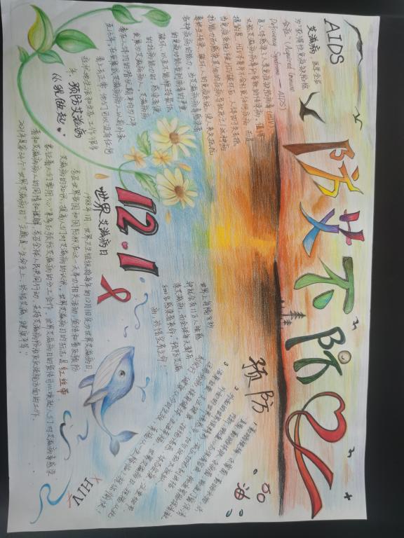 艾滋病手抄报大赛。本项活动以赛带教,影响深远。参赛同学充分发挥自己的创造力与想象力,在表达对艾滋病人的关心的同时,让更多的同学通过欣赏宣传画学到艾滋病的相关知识。