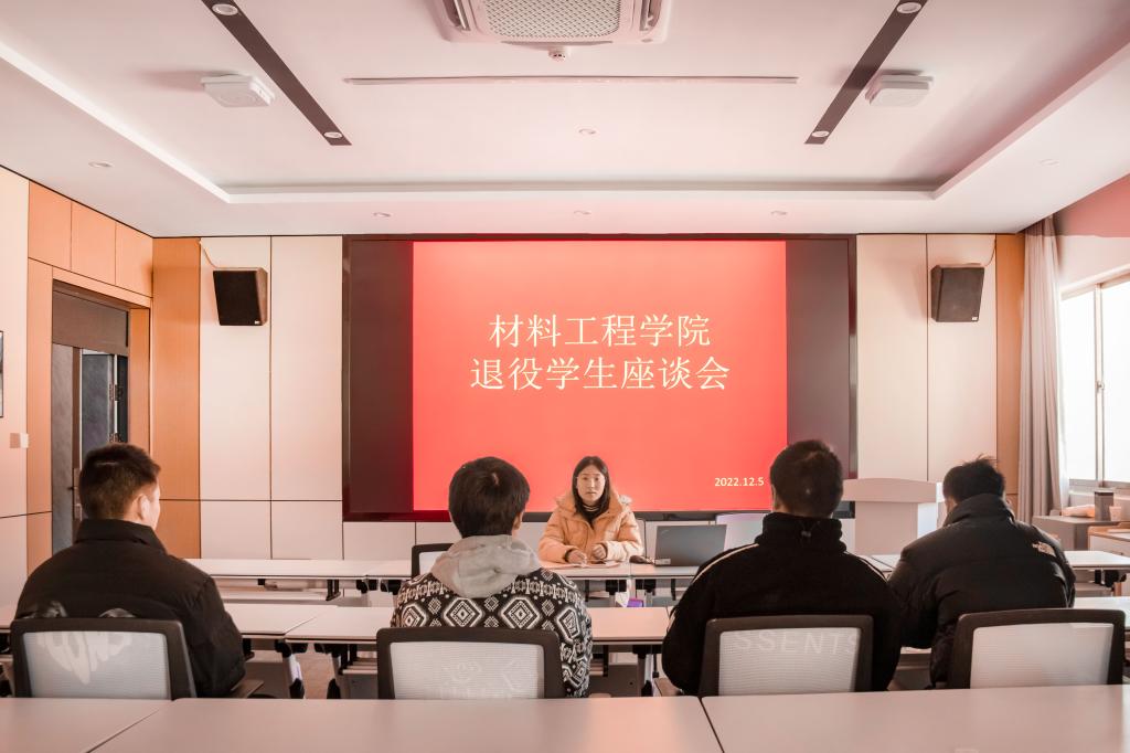 为了帮助退役学生更快融入大学生活,12月5日,材料工程学院在知行楼A506会议室召开退役学生座谈会。材料工程学院辅导员王亚男主持本次会议,2022年退役学生参加。