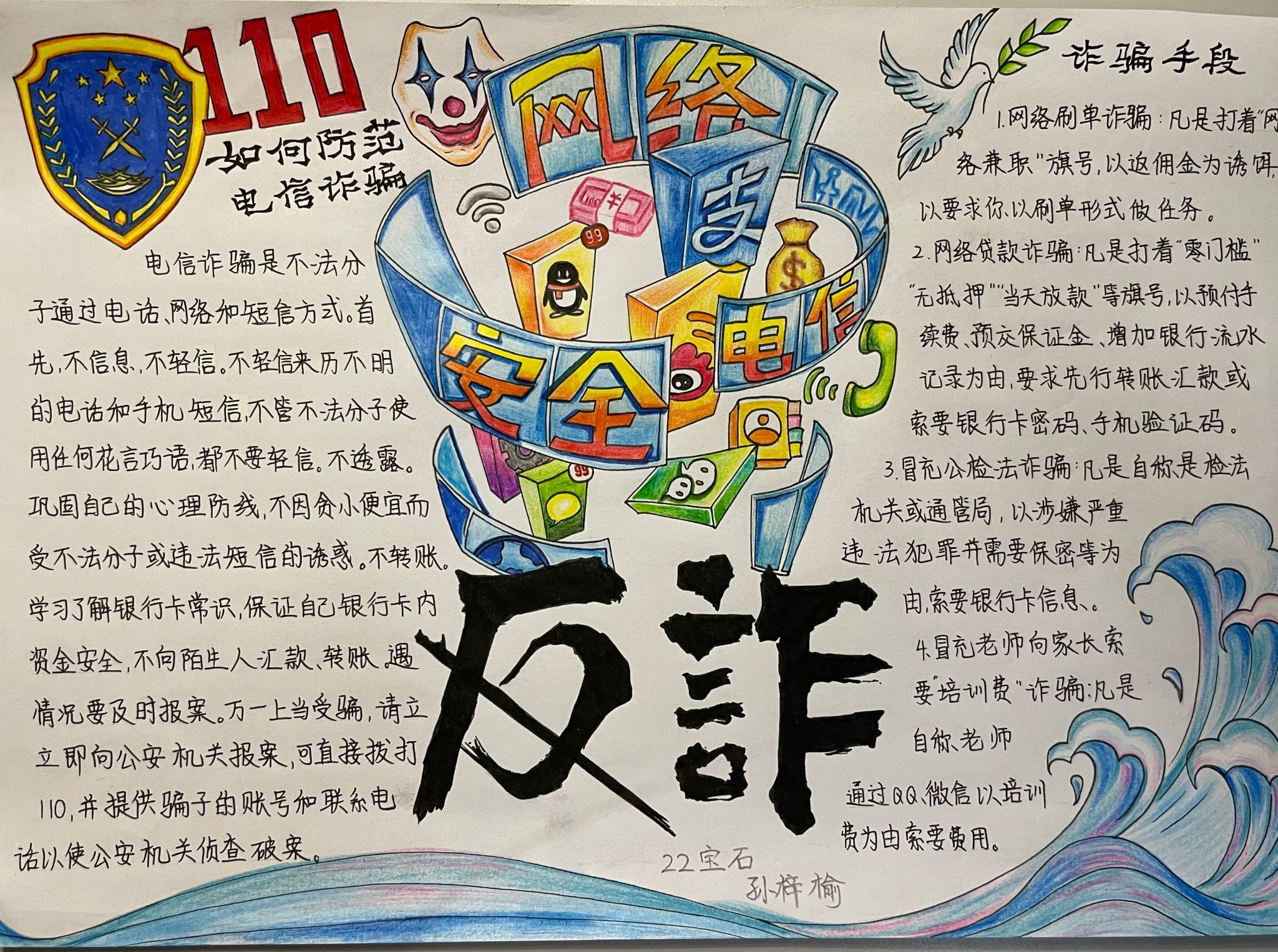 本次活动以拍摄反诈宣讲视频、绘制手抄报等形式开展,共收集优秀作品17件,并于4月15日前贴在学院宣传栏展示,以供全院师生参观。同学们围绕防诈骗的主题,结合自身实际经验,用充满艺术与创意的方式描绘出一幅幅有关电信诈骗常见种类、防范电信诈骗注意事项的作品,生动形象、贴近生活、发人深省,为师生敲响了反诈警钟。