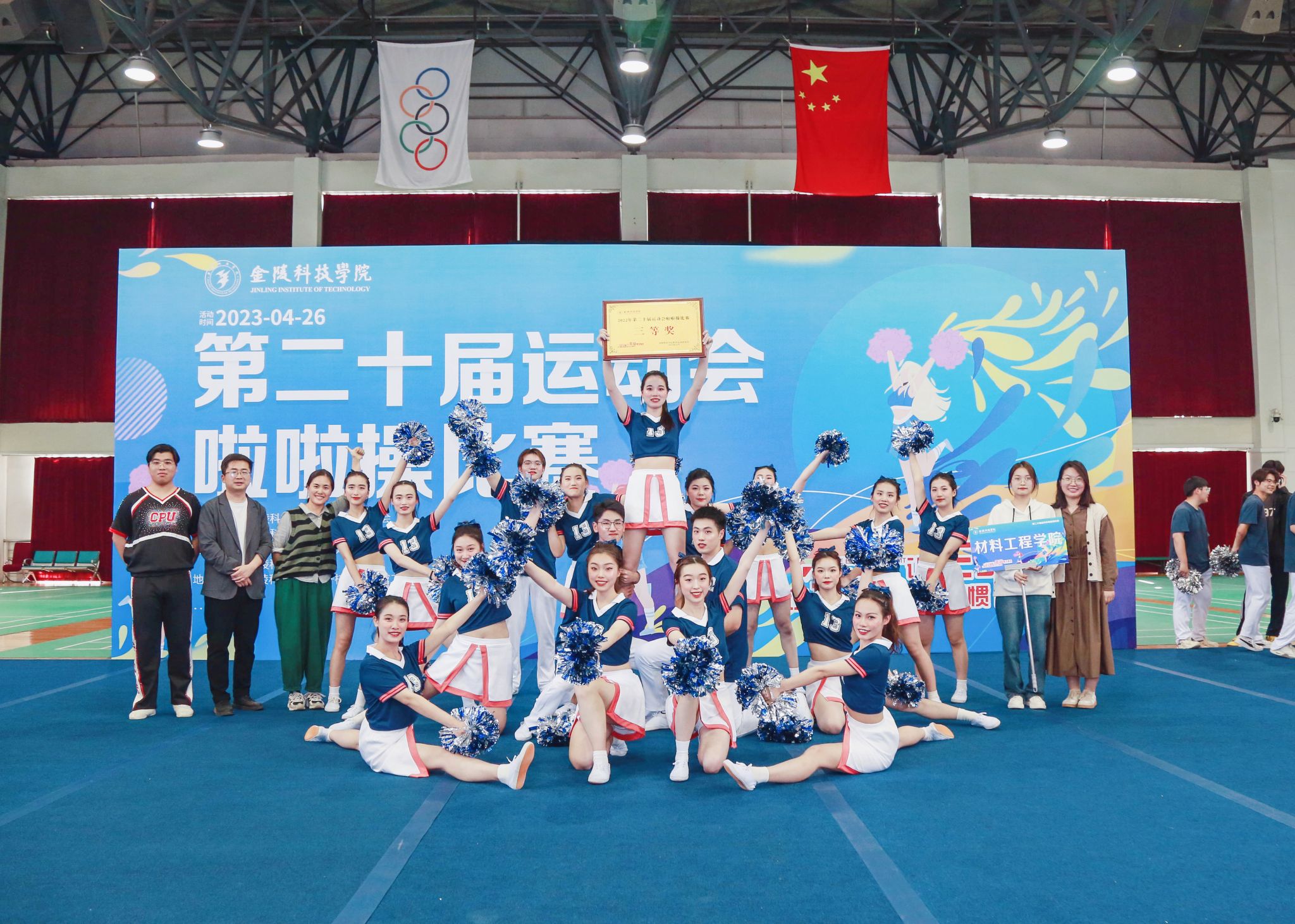 2023年4月26日,金陵科技学院第二十届运动会啦啦操比赛在南区体育馆顺利举行。材料工程学院的同学们积极参加,凭着饱满的热情、精彩的表演获得评委组一致认可,取得了第六名的优异成绩,荣获三等奖。