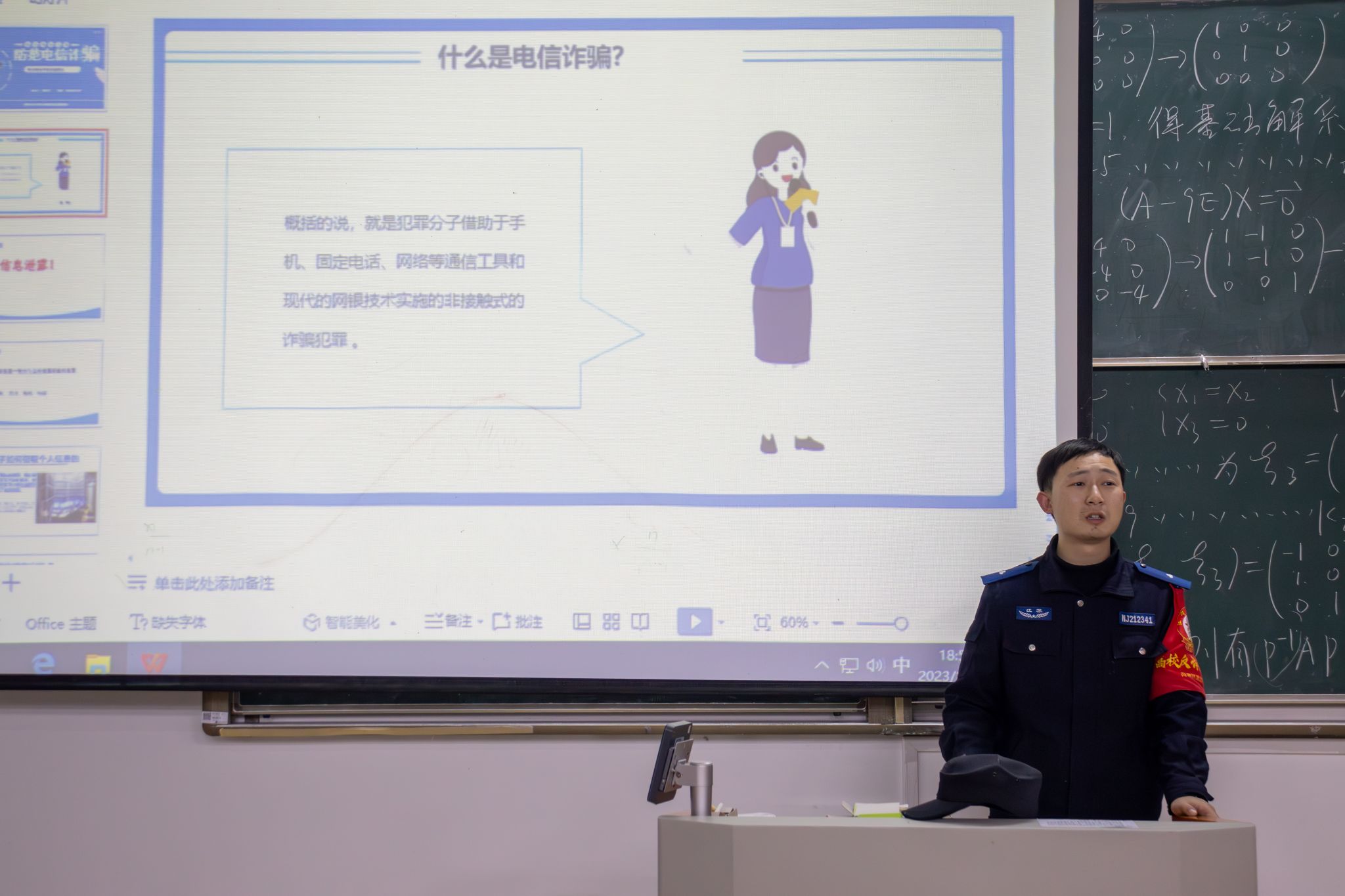 为了积极响应校园反诈宣传的号召,共建安全校园防线,材料工程学院于12月28日晚在7300教室举办了反诈民警进校园的活动。本次活动邀请了江宁高新区派出所张警官为大一新生开展以“网络电信诈骗”为主题的反诈宣传活动。