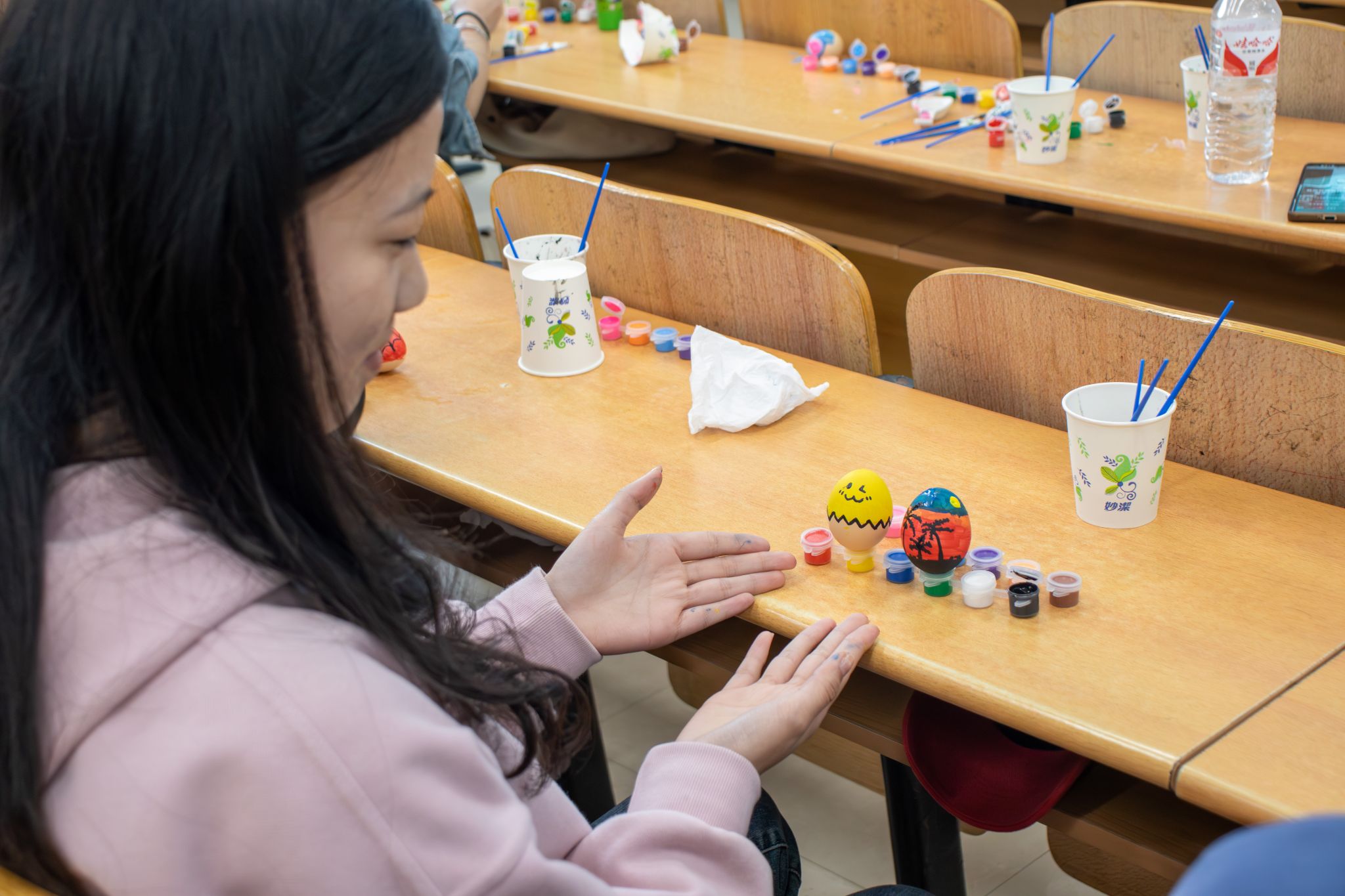 活动伊始,同学们便纷纷动手尝试立蛋,他们或调整鸡蛋的摆放角度,或利用桌面的微小不平来寻找平衡点。经过一番努力,许多同学成功地将鸡蛋稳稳地立在了桌面上,喜悦之情溢于言表。立蛋成功后,同学们拿起画笔,在鸡蛋上描绘出各种图案。有的画出了春天的花朵,有的画出了可爱的小动物,还有的同学将鸡蛋装饰成了五彩斑斓的艺术品,大家充分发挥了动手能力和想象力,将普通的鸡蛋变成了充满个性的作品。最终,19件作品脱颖而出,这不仅展示了同学们的绘画才华,更体现了他们对传统文化的热爱与传承。