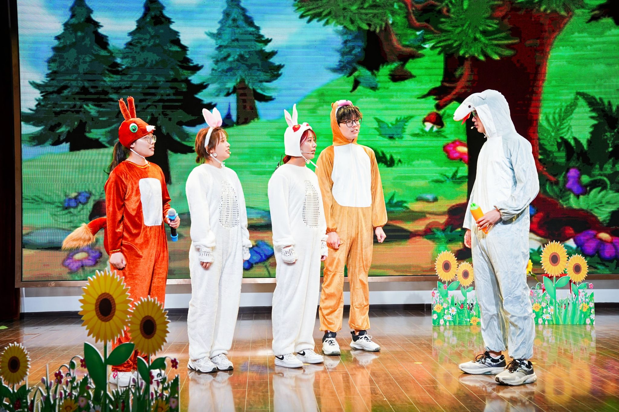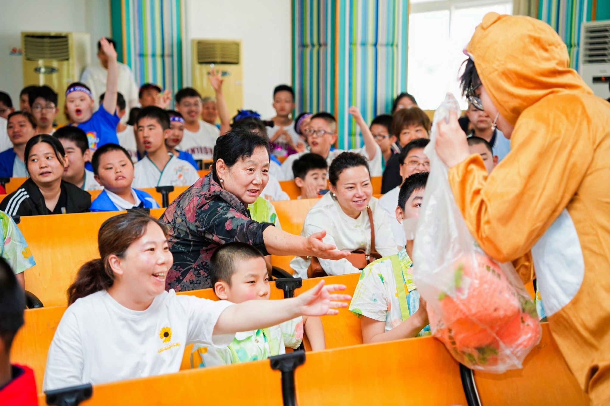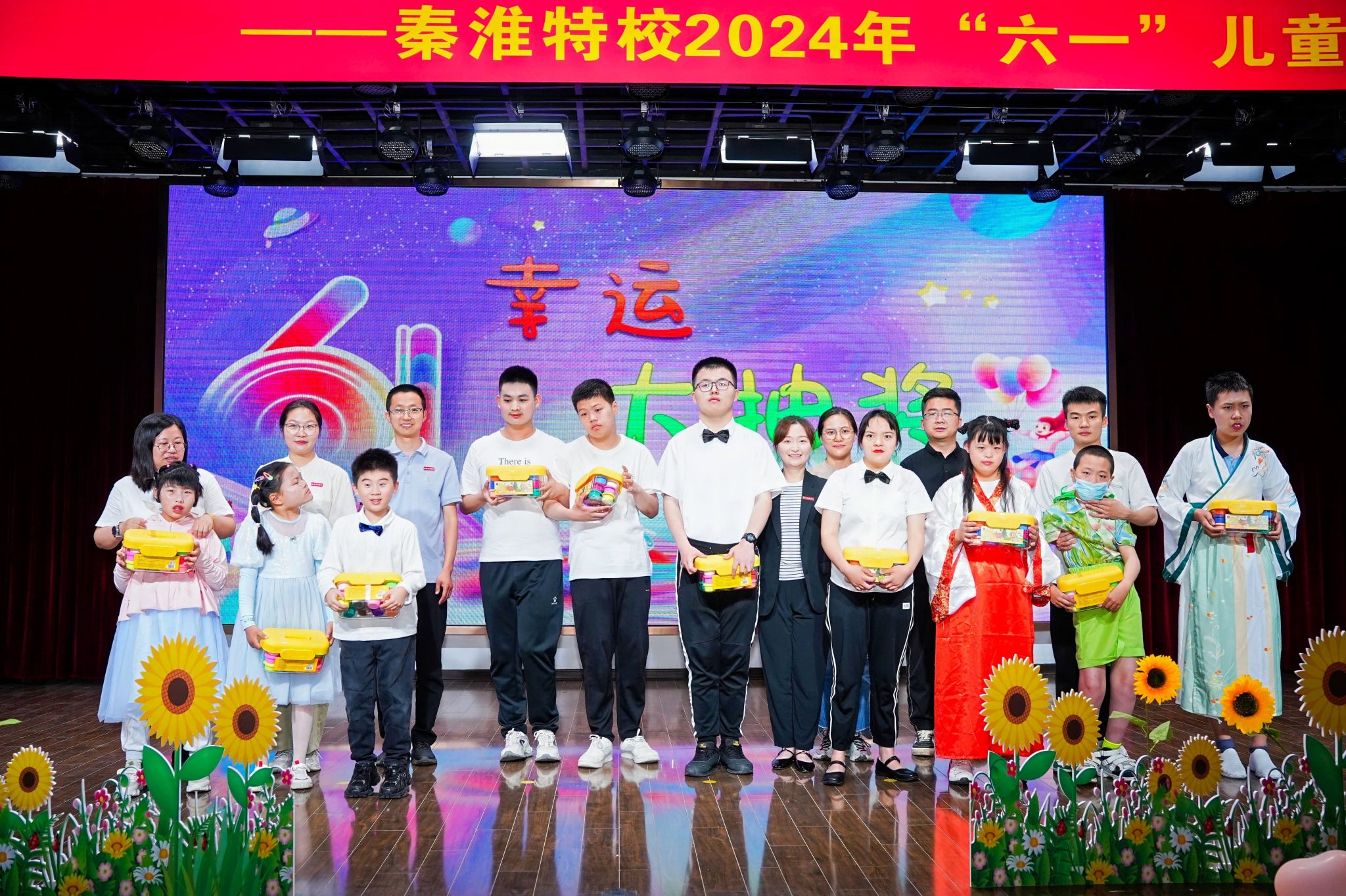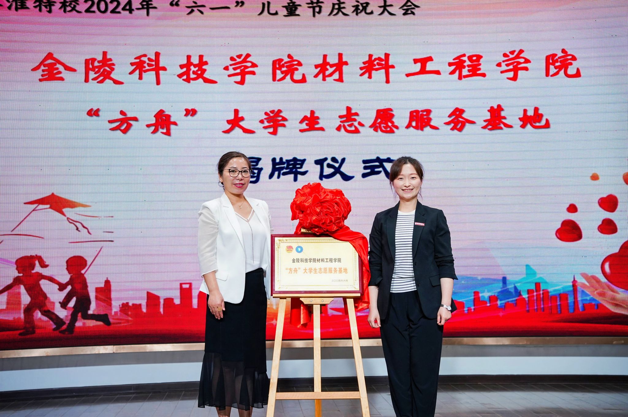 精彩纷呈的六一汇演在孩子们的欢声笑语中拉开帷幕,心理社的志愿者们共同演绎了儿童心理情景剧《猜猜我有多爱你》。表演刚一开场志愿者就为孩子们送上惊喜小礼品,将气氛推至高潮,舞台上小动物们间的故事也让孩子们在“感受爱、懂得爱”的同时,更学会了“分享爱、表达爱”。接着,党委副书记韩铖与秦淮特殊教育学校校长张慧共同为“方舟”大学生志愿服务基地揭牌。韩铖在发言中对秦淮特殊教育学校对我院志愿服务的信任与支持表示感谢。她表示,希望在秦淮特校的支持指导下,院校携手并进,组织开展更多有内涵、有活力、有温度的志愿服务活动,打造特殊教育与心理健康融合共生的志愿服务特色品牌,为推进特殊教育、高等教育的高质量发展作出积极贡献。