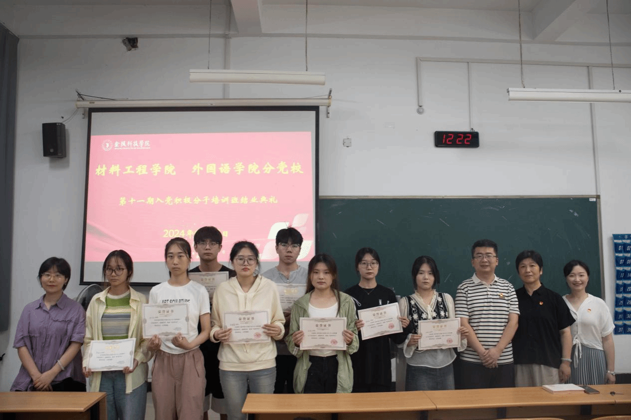为切实做好学生入党积极分子培养教育工作,引导学生进一步端正入党动机、增强理论素养,不断提升学生党员发展质量,2024年5月15日至6月28日材料工程学院、外国语学院分党校联合举办第十一期入党积极分子培训班。本次培训共有98名学生入党积极分子参加,其中82人顺利结业,8名学员获评“优秀学员”称号。