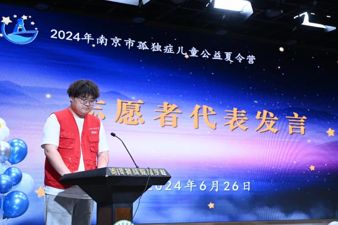 开营仪式在欢快的《向快乐出发》舞蹈中拉开了序幕。“方舟”心理社社长冯伟作为大学生志愿者代表上台发言,他表示,志愿者们将积极践行志愿精神,遵守志愿规范,用心服务,用情呵护,为特需儿童夏令营的顺利进行贡献青春力量。