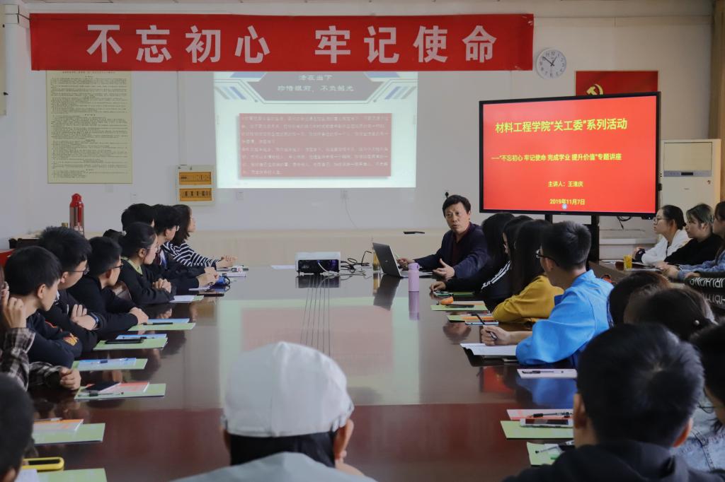 为了让同学们合理规划大学四年的学习生活,根据材料工程学院“关工委”的工作安排,2019年11月7日下午材料工程学院在工科楼会议室举办“不忘初心、牢记使命,完成学业、提升价值”专题讲座。讲座特邀材料工程学院原院长王淮庆为大家主讲,学院党委副书记(主持工作)喻强、综合办公室主任韩奕出席,2019级新生班代表40余人参加本次活动。