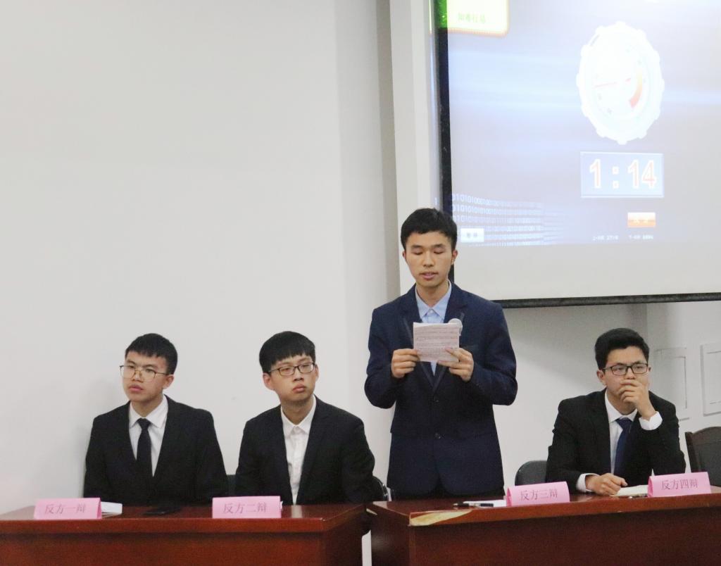 参赛队伍由抽签决定辩论方,正反方一辩各做三分钟陈词。在开篇立论环节,正方以“知行合一”为中心,逐步展开阐述“知难”这一观点。反方辩手提出“知行”与辩题的紧密联系,引出“行难”的论述。攻辩环节,双方选手据理力争,引经据典,围绕 “知难还是行难”展开了激烈的辩论。辩论赛以正反方四辩精彩的三分钟结辩作为结束。整场比赛高潮迭起,精彩纷呈,现场气氛十分热烈。经过激烈的比拼,由董文涛、李宇航、李秉轩、徐剑组成的反方队伍获得了本次比赛的胜利。正方三辩张侃同学荣获“最佳辩手”的称号。