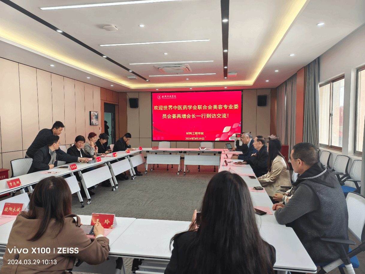 3月29日,国家中医药管理局原国际司司长姜再增、世界中医药学会联合会美容专业委员会会长李永昌和秘书处成员到访我校。材料工程学院党委书记陈健出席座谈会并致欢迎词,副院长管航敏介绍了材料工程学院的发展情况,副书记韩诚带队参观了视觉健康大学生创新创业工作室,视光系党支部书记李新华介绍了视光专业的情况。