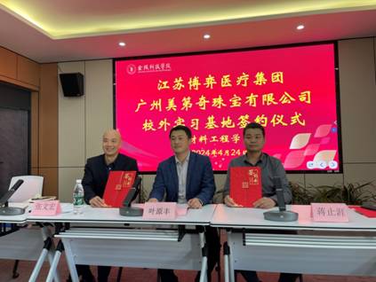 4月24日下午,材料工程学院与江苏博弈医疗集团携手,共同举办了江苏博弈医疗集团校外实习基地签约仪式。材料工程学院院长叶原丰、党委书记陈健、江苏博弈集团副总裁张文宏、培育钻石事业部负责人徐悦阳、19级校友王馨悦,珠宝系相关教师及学生参加了此次座谈会。