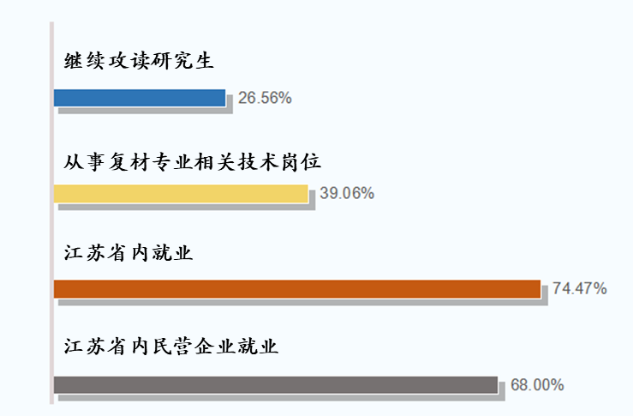 根据2019届毕业生签订的三方协议,对毕业生出口能力和就业方向与培养目标的吻合情况进行分析。截止2019年9月12日,2019届复合材料与工程共有64名学生拿到学位证和毕业证顺利毕业,他们的工作单位、单位所在地、行业领域等信息见附录2.3。其中,有17名毕业生攻读本专业相关研究生或出国深造,经过进一步的学习可以成长为高层应用型、研究型或管理型人才,占毕业生的26.56%;25名毕业生从事复合材料与工程专业相关技术岗位,符合在材料及相关行业开展技术、工艺和产品研发活动的培养目标要求,占毕业生的39.06%;少数毕业生从事建筑、商务、金融等相关工作。就业的学生中,已签订三方并在江苏省内工作的有35名,占就业毕业生的74.47%,符合学校和专业服务地方的人才培养定位;江苏省复合材料领域的民营企业活跃,68%的学生在江苏省民营企业工作,说明本专业培养目标符合行业发展需求。上述分析数据详见图2-5。毕业生认为培养目标中,应加强复合材料与工程实践能力的培养,有助于在就业中获得较好的竞争力。